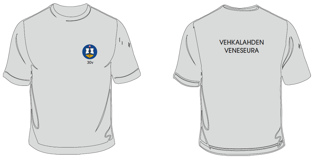 Ollaan painattamassa veneseuran t-paitoja. Paidat ovat laadukkaampia kuin halvimmat versiot. Rintaan tulee pienehkö veneseuran logo ja selkään ’Vehkalahden Veneseura’ -teksti.